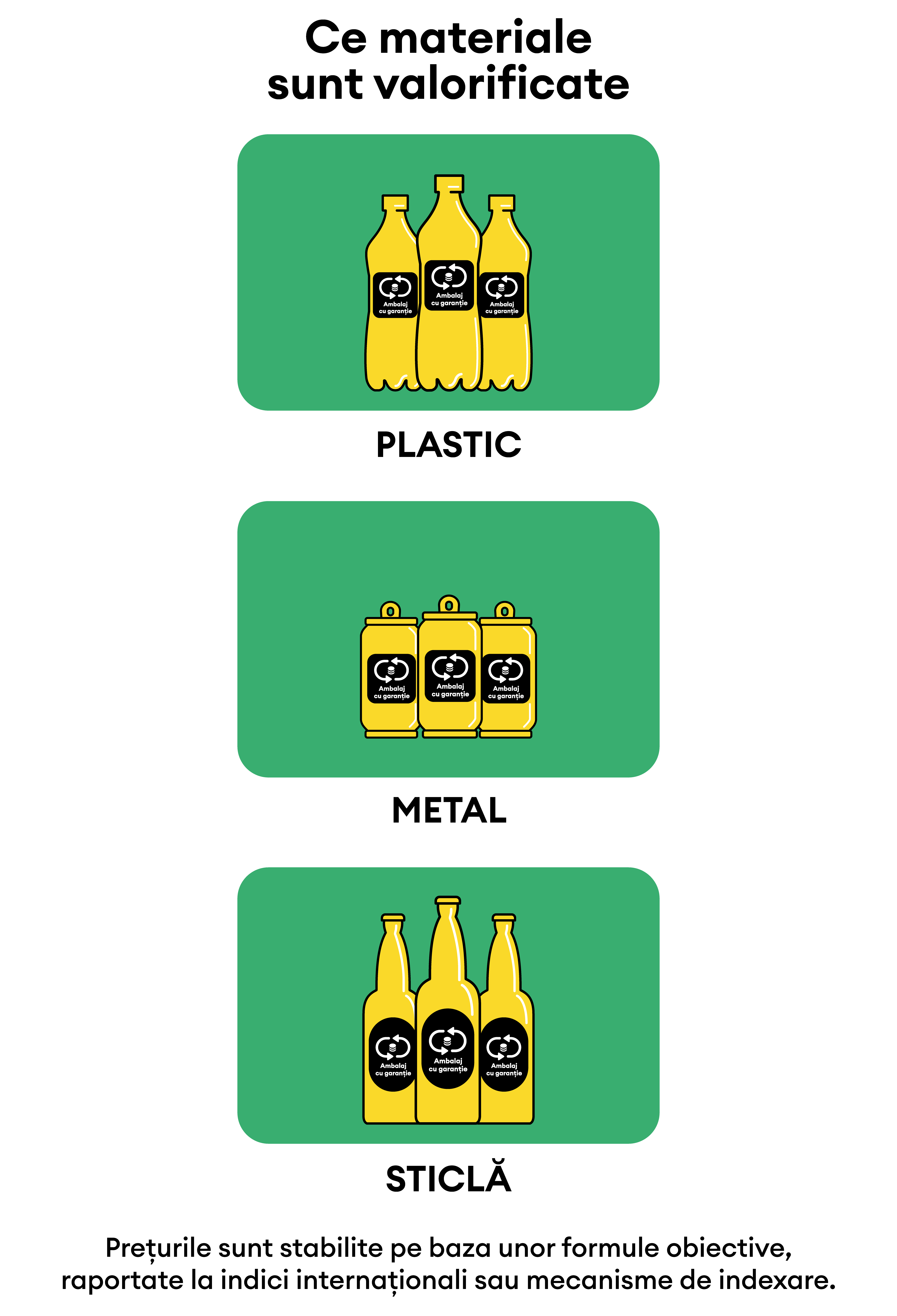 RetuRO valorifică materialele colectate prin SGR (plastic, metal și sticlă) prin mecanisme transparente și competitive, în conformitate cu legislația în vigoare.